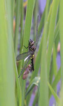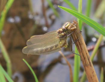 キトンボ ウシガエル捕獲のために池岸に設置していた かにかごの中で羽化していました。 (2016.6.29 湿生植物園) |