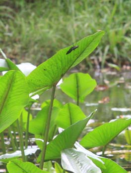 羽化したばかりのモノサシトンボ 水草コウホネの葉柄で羽化していました。 (2016.7.6 湿生植物園) |