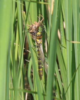 オオヤマトンボ マコモの葉に登って羽化していました。 (2016.6.2 昆虫の森 田尻大池岸で) |