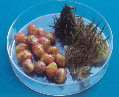 名前の由来:葉柄や葉、萼や果実に多数の刺があるのを鬼にたとえたことによる。 生態:池や沼に生育する。富栄養な池では葉が大型になり、水面を覆うことがある。発生しない年もあるなど、毎年見られるとは限らない。 また、池の改修工事の後に大量に発生することがあり、貴重種に指定されている地域では問題になることもある。種皮が硬く、長期間保存されていることによる。 保護・保全:絶滅が心配される水草である。センターでは上池で生育するが、毎年発芽はするものの、葉が大きくなって多数の種子をつけるのは稀である。攪乱が刺激となって出てくるが、平時には繁殖力は旺盛ではないようだ。 |