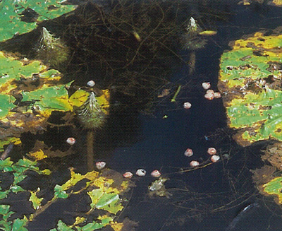 ![]() 寒天質に包まれた種子が多数水面に浮かんで移動する。 |